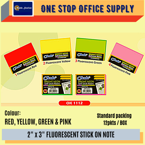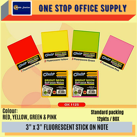 OKADA 3" x 3" FLORECENT POST IT NOTE / MEMO PAD STICKY NOTE / NOTA MELEKAT MEMO PAD